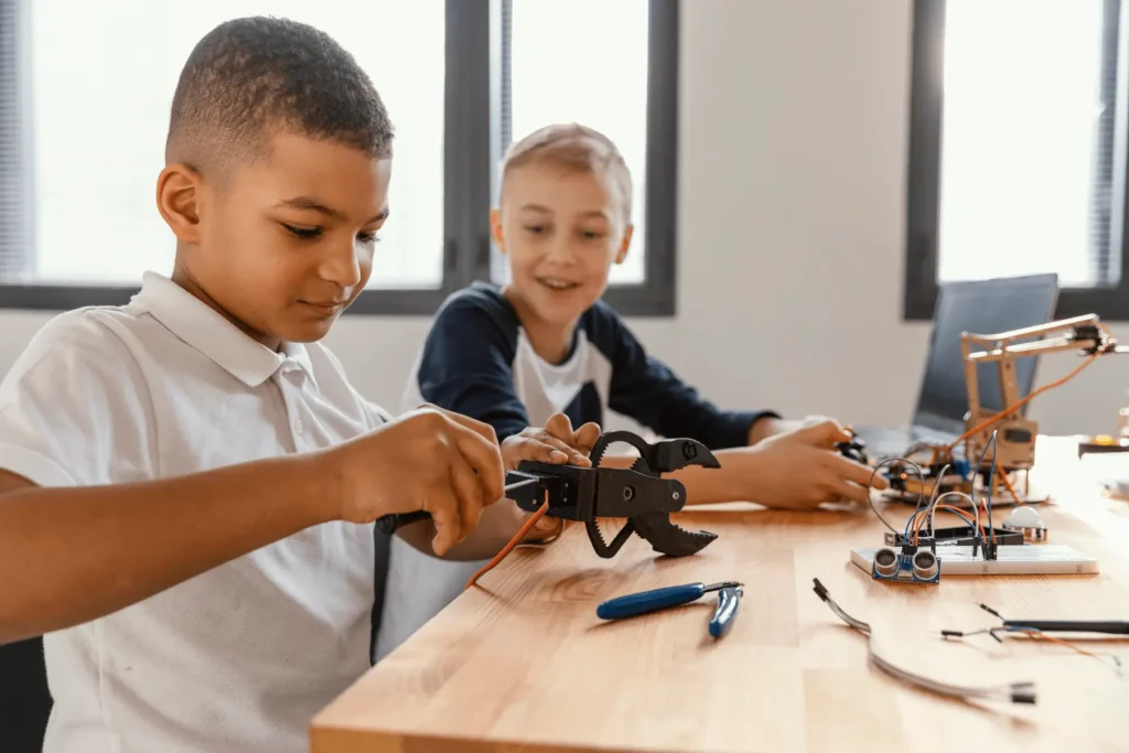 Students learn by doing—working with robots, sensors, electronics, and code to solve real engineering challenges.